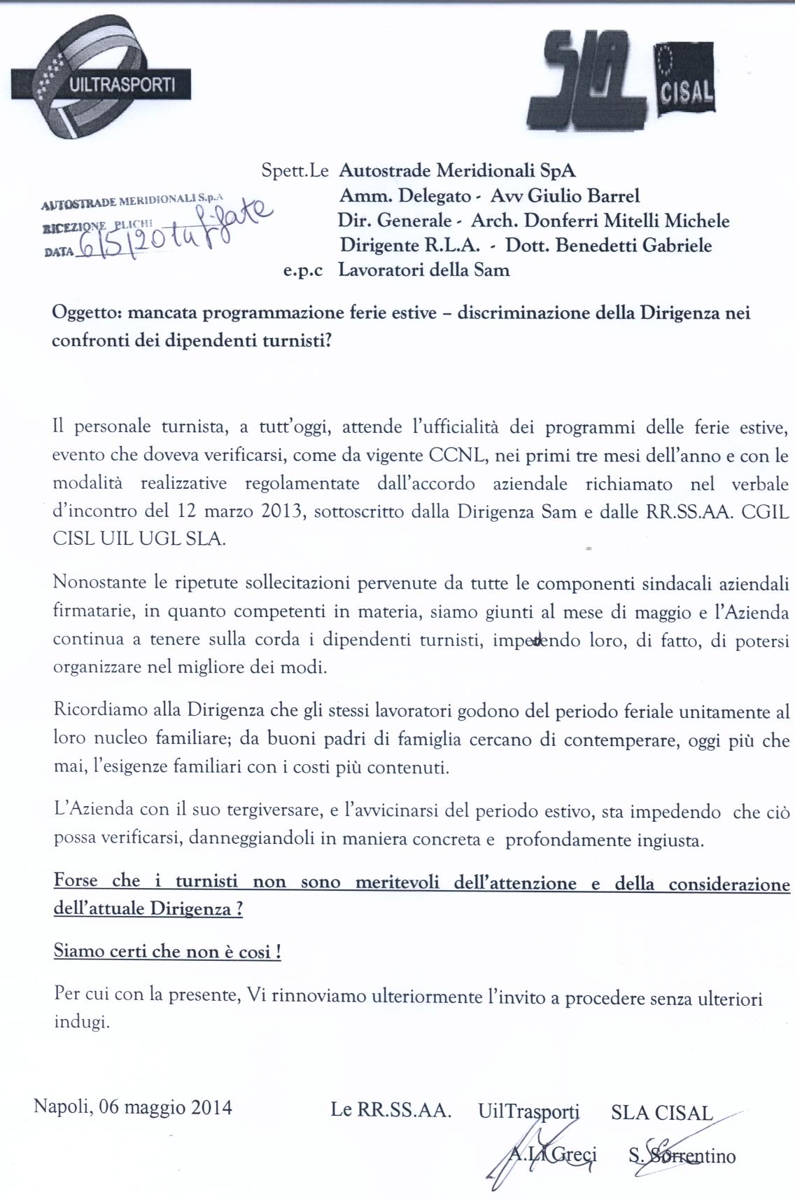 SAM : lettera RSA UIL e SLA sulla gestione delle ferie del personale turnista 2014